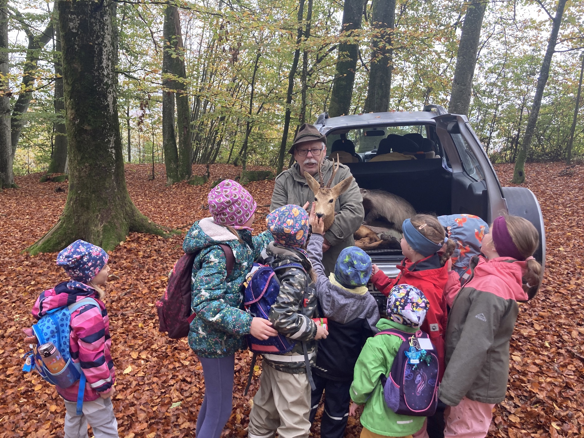 Besonders angetan waren die Kinder von den zahlreichen Tier-Präparationen die Rudolf Cruchten extra mitgebracht hatte. Vom Käuzchen über verschiedene Marder bis hin zu Reh und Dachs war alles dabei. Dazu gab es viel über die Tiere zu erfahren und zu erfühlen. Und das alles im wunderbar herbstlichen Wald.